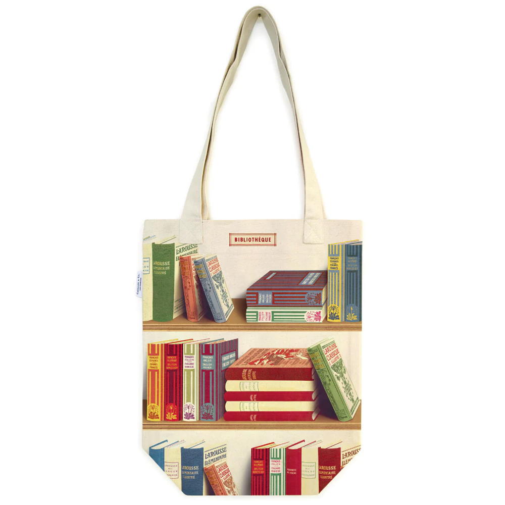 This canvas tote complete with an interior pocket, features a vintage library image.