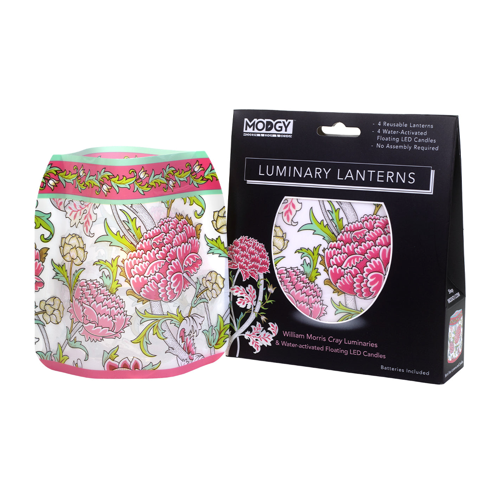 These flameless, reusable luminaries ideal for indoor and outdoor use feature a detail from a design by William Morris (1834–1896). An elegant centerpiece for everyday living areas, as well as for dinner and garden parties, special events and weddings, the lanterns are shatterproof, lightweight and easy to store. Simply pour water into each luminary, place the candles inside and enjoy the ambiance!