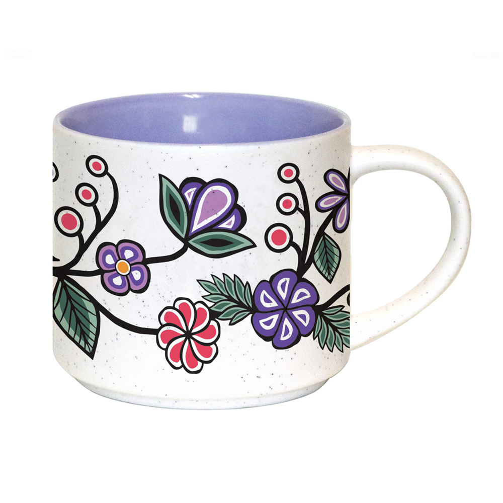 This ceramic mug, with a speckled matte exterior and a glossy, coloured interior, features an artwork by Storm Angeconeb, a self-taught Indigenous artist from Lac Seul First Nation.