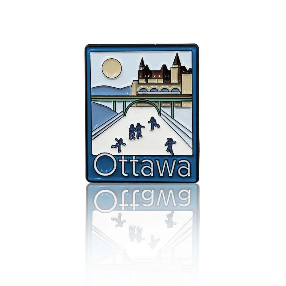 Accessorize with this lapel pin featuring the iconic Rideau Canal skateway. A perfect keepsake for winter enthusiasts, travellers, and collectors.