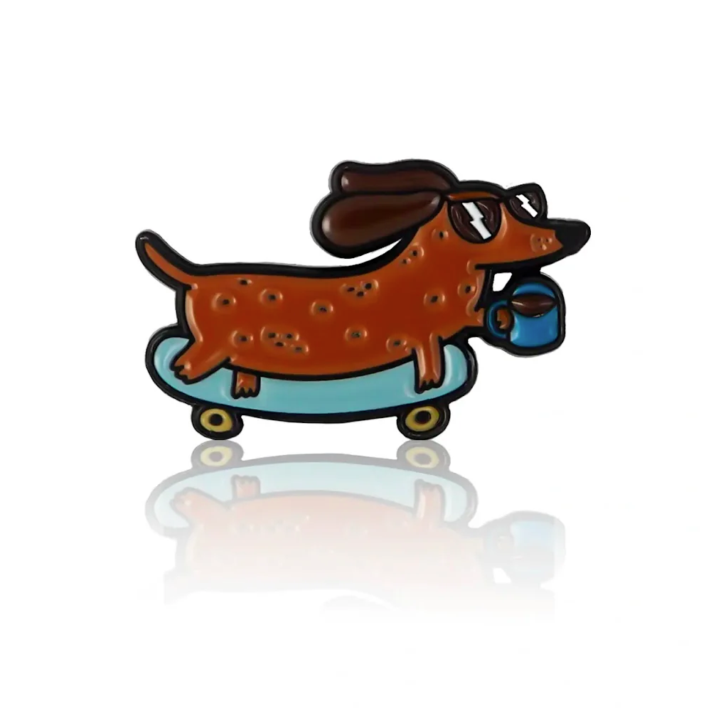 Unit price perAccessorize with this lapel pin featuring a skateboarding sausage dog. A perfect addition to clothing or as a gift.