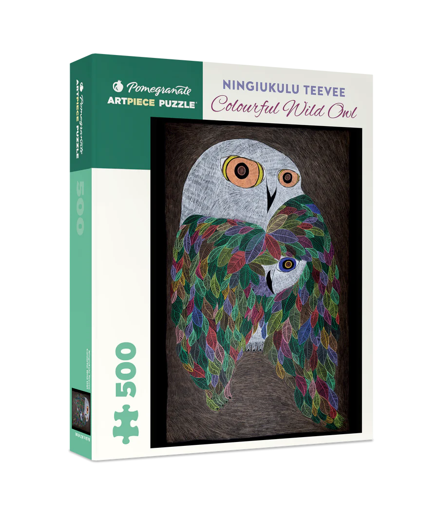 Ce casse-tête de 500 pièces est inspiré de l'œuvre Colourful Wild Owl (2013) de l'artiste de Cape Dorset Ningeokuluk Teevee.