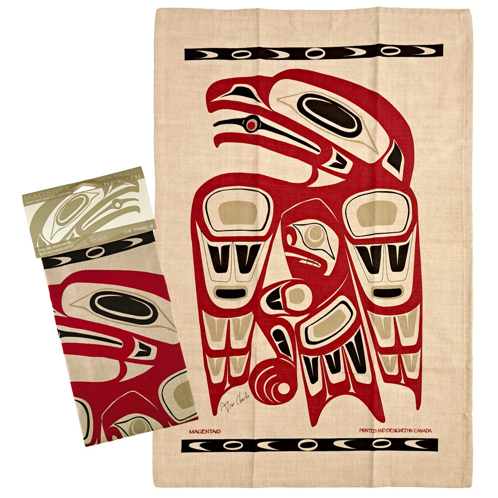 Ce linge à vaisselle 100 % coton reproduit un motif par l'artiste salish de la Côte Jim Charlie.