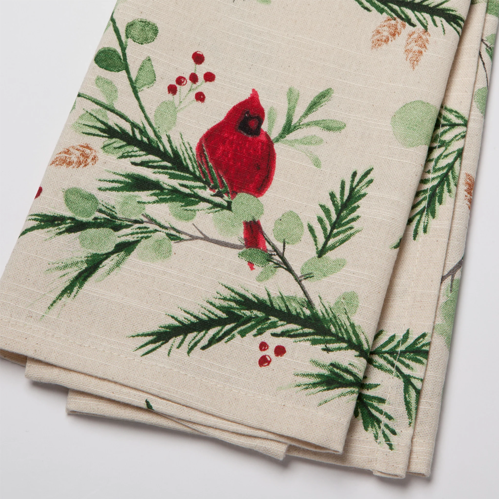 Ajoutez de la vie et du caractère à votre cuisine avec ce linge à vaisselle amusant et coloré, présentant des oiseaux de la forêt perchés sur des branches de sapin et des baies d'hiver.