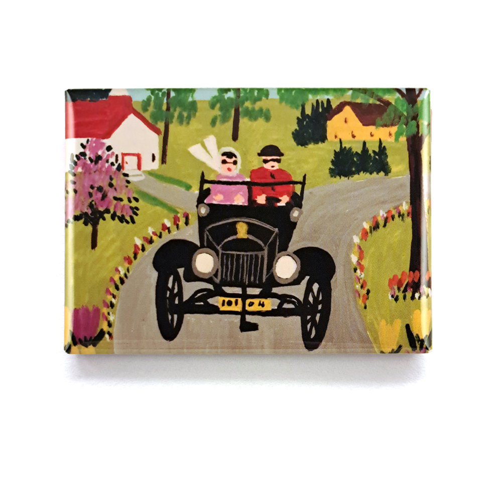 Cet aimant reproduit l’œuvre Model T on Tour (v. 1960s) de Maud Lewis (1903–1970).