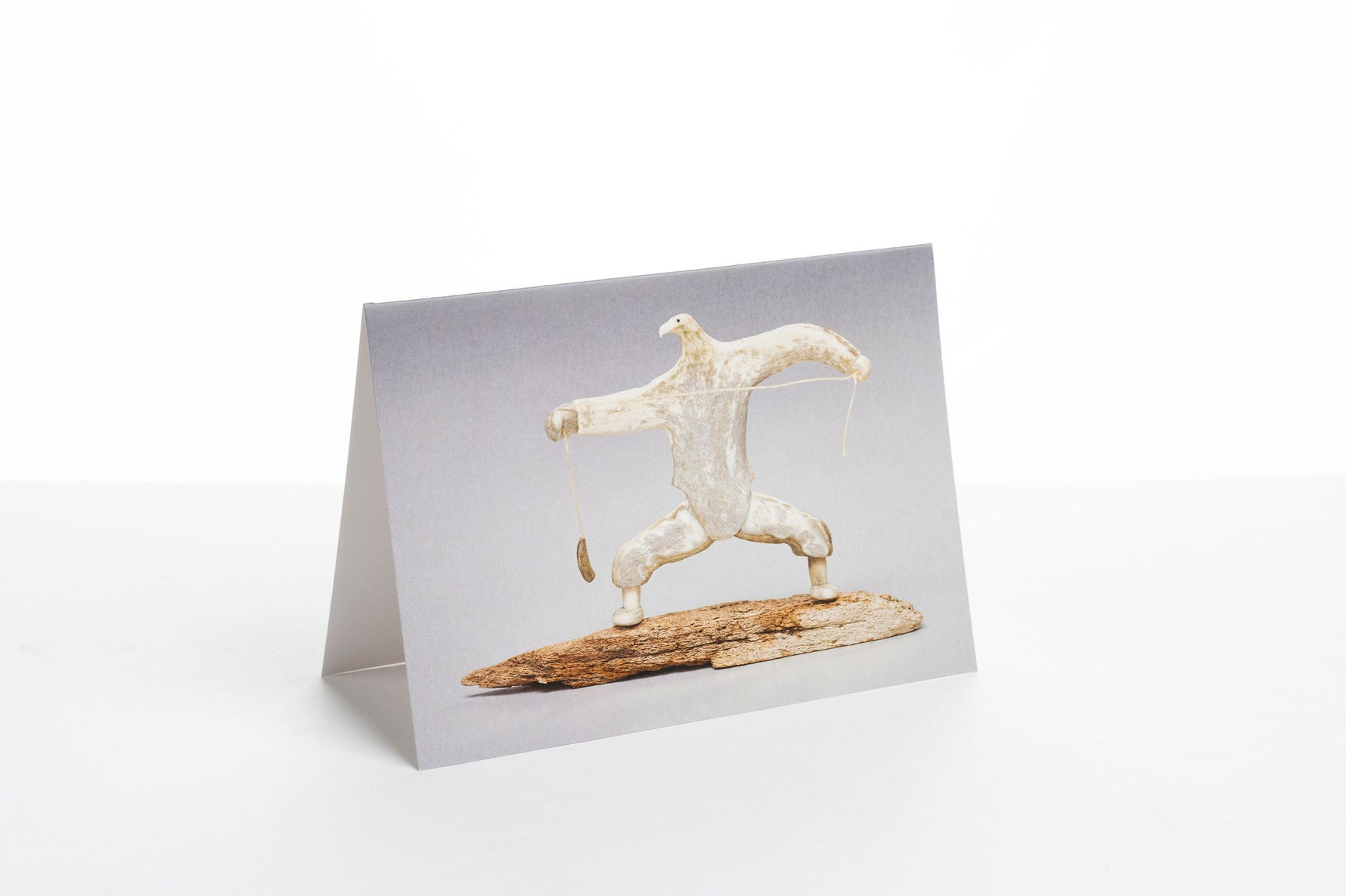 Cette carte double reproduit la sculpture Oiseau-chaman avec bola (1988) de l'artiste inuit Nick Sikkuark (1943–2013).