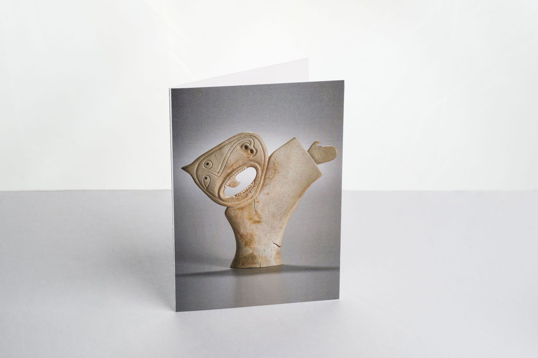 L’exagération des traits et l’utilisation créative des os de baleine caractéristiques de l’œuvre d’Ashevak ont contribué ç définir le style expressif de la région de Kitikmeot, au Nunavut. Les yeux dissemblables, signe d’une vision exceptionnelle, et la main enveloppée d’une mitaine, symbole d’une faculté spirituelle, indiquent que cette créature est un être puissant venu d’un autre monde.