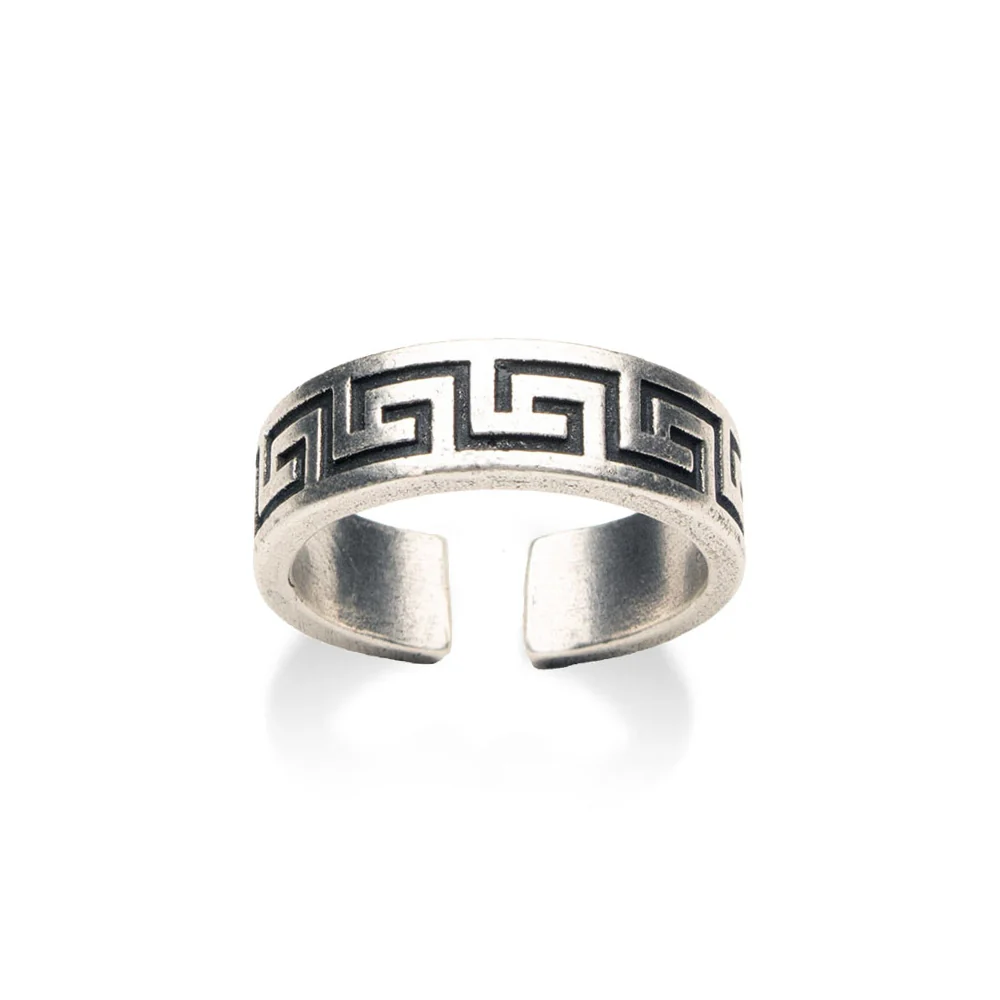 This adjustable ring features the Meander or Greek key design, a pattern found in Classical art and architecture.