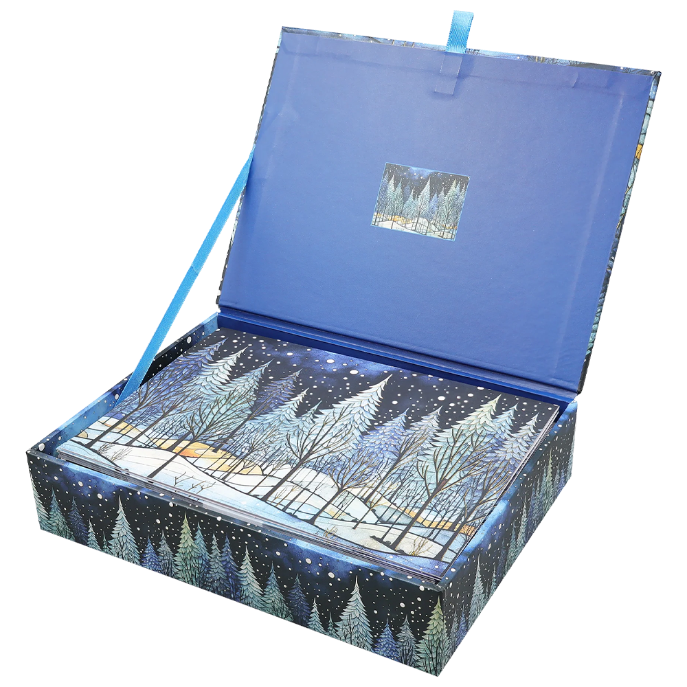 Unit price perThis set of 20 notecards features an illustration of snow falling on a tranquil forest at nightfall.