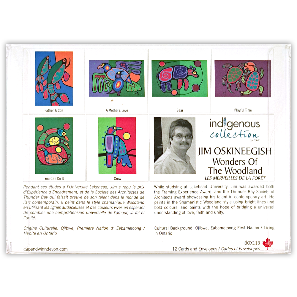 Unit price perThis set of 12 notecards (two of each of six styles) features reproductions of the following designs by Ojibwe artist Jim Oskineegish: Father & Son, A Mother's Love, Bear, Playful Time, You Can Do It, and Crow.